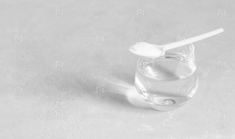 Коллаген на сером фоне. Коллагеновый протеиновый порошок в ложке и стакан воды крупным планом. Баннер. Копировать пространство
