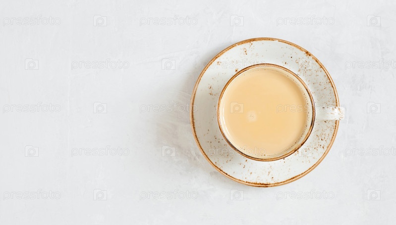 Кофе латте. Капучино на белом бетонном фоне. Индийский чай масала. Скопируйте пространство, вид сверху, плоская планировка
