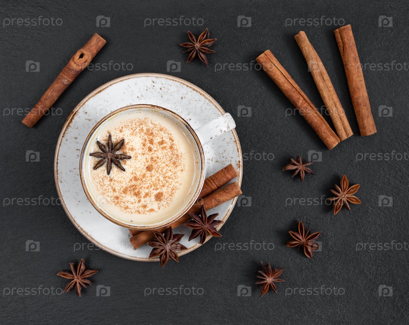 Чай масала со специями и молоком. Индийский горячий напиток на фоне темного камня. Вид сверху