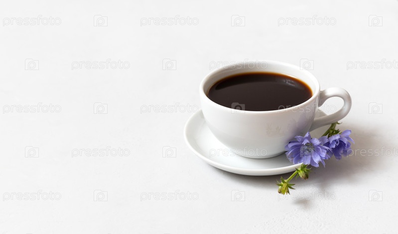 Цикорий кофейный напиток и синий цветок цикория на белом фоне. Кофе без кофеина. Скопируйте пространство