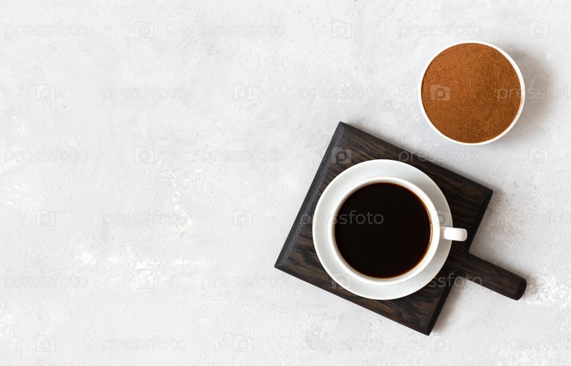 Кофейная чашка на белом фоне. Напиток из цикория и порошок цикория. Натуральный заменитель кофе. Место для текста. Вид сверху, плоская планировка