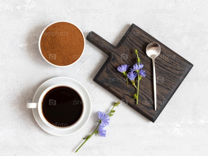 Напиток из цикория, порошок цикория и синие цветы на белом фоне. Полезный травяной напиток без кофеина. Вид сверху, плоская планировка