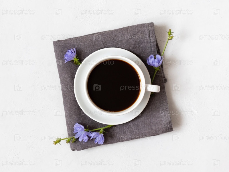 Здоровый напиток из цикория и голубые цветы на серой салфетке. Травяной заменитель кофе. Напиток из цикория на белом фоне. Вид сверху