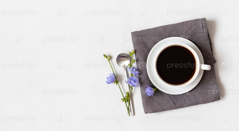 Чашка с кофе цикория на серой салфетке и голубыми цветами на белом фоне. Заменитель кофе. Здоровый напиток. Скопируйте пространство, вид сверху