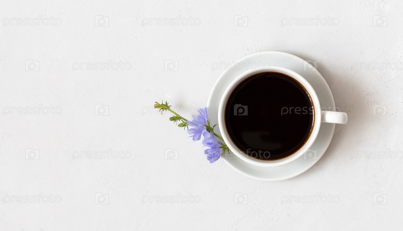 Здоровый напиток из цикория и голубой цветок на белом фоне. Травяной заменитель кофе. Скопируйте пространство, вид сверху