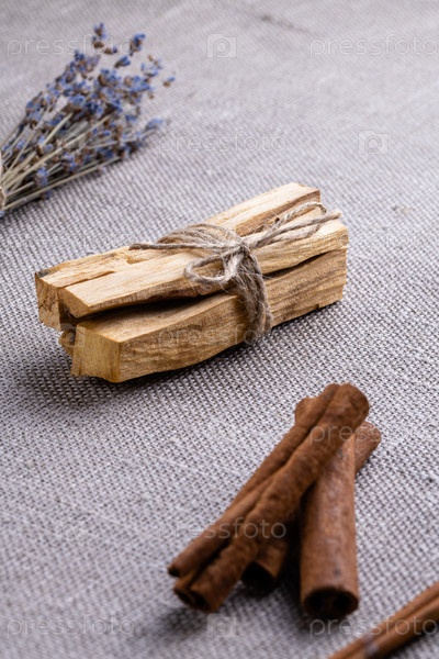 Набор для ароматизации помещения во время медитации и йоги, ароматизаторы воздуха в жилище: деревянные палочки пало санто, лаванда, палочки корицы крупным планом на фоне мешковины