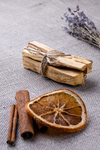 Набор для ароматизации комнаты во время медитации и йоги, ароматизаторы воздуха в жилище: деревянные палочки пало-санто, лаванда, цитрусовые, дольки апельсина, палочки корицы крупным планом на фоне мешковины