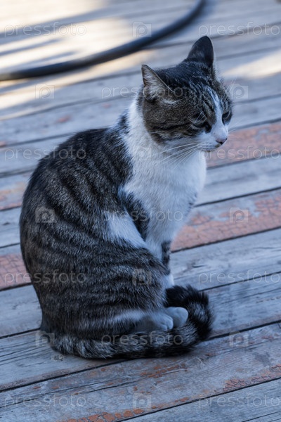 Симпатичный кот сидит на деревянном полу в саду