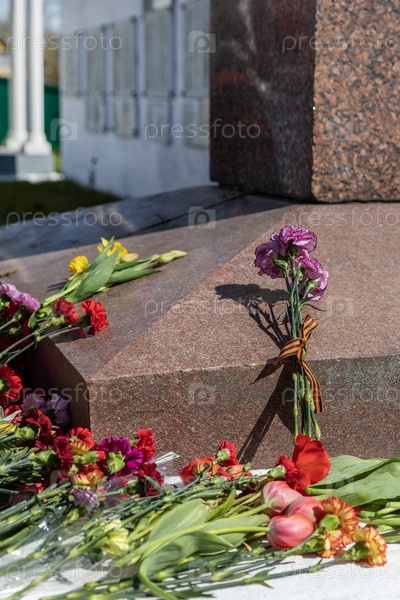 Россия. Санкт-Петербург. Цветы у мемориала погибшим воинам в праздник Дня Победы. Россия. Санкт-Петербург. Цветки на мемориале павших солдат в День Победы