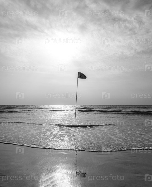Сигнальный флаг, стоящий среди волн в морском прибое