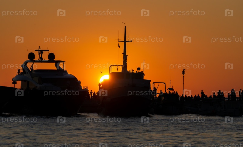 Морской закат с яхтами и людьми на пирсе, провожающими солнце