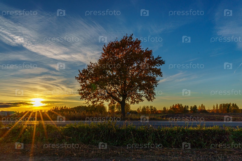 Осенний пейзаж на закате, золотая осень. Золотой закат с красивым небом