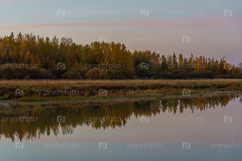 Осенний пейзаж с изображением деревьев на берегу реки. Осенний пейзаж на закате. Золотой закат с красивым небом