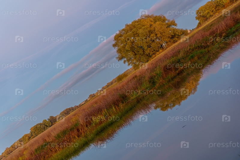 Осенний пейзаж с изображением деревьев на берегу реки. Осенний пейзаж на закате. Золотой закат с красивым небом