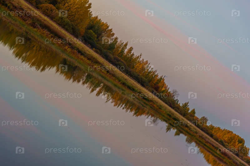 Осенний пейзаж с изображением деревьев на берегу реки. Осенний пейзаж на закате. Золотой закат с красивым небом