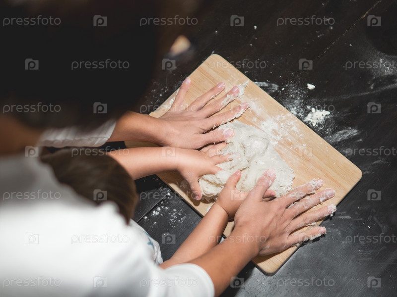 Мать и сын готовят вместе. Мама и малыш месят тесто из муки и яиц на черном деревянном столе. Время для семьи. Веселье на кухне. Развитие мелкой моторики