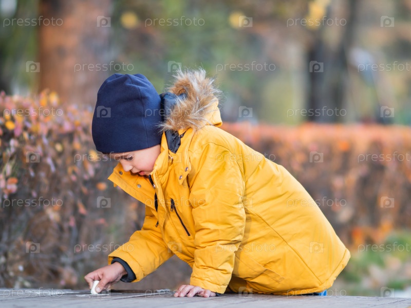 Маленький мальчик что-то пишет или рисует мелом на асфальте. Творческий досуг на открытом воздухе осенью