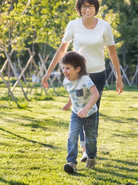 Семейная жизнь. Мать и сын играют в парке. Летние вибрации. Активная подвижная игра. Образ жизни. Активный отдых на свежем воздухе