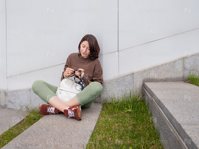 Женщина вяжет крючком на открытом воздухе. Спокойный отдых женщины в городском парке. Антистрессовое хобби