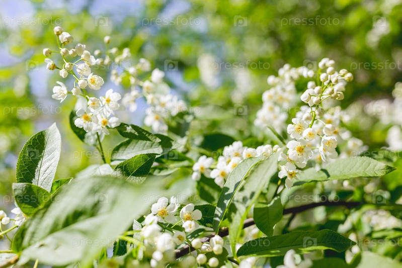 Весенний фон с маленькими белыми цветками черемухи на солнечном свете. Красота в природе