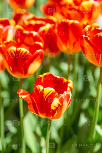 Красочные тюльпаны в тени красного и желтого на солнечном свете. Красивые цветы в цвету среди зеленых листьев растут в саду. Цветоводство и садоводство в теплое время года