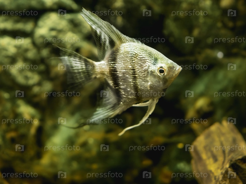 Плавучая Pterophyllum scalare или рыба-ангел в аквариуме.Сладководная аквариумная рыбка с блестящей чешуей