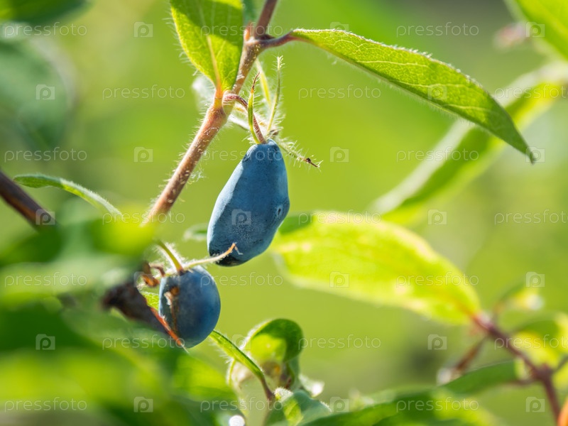 Синие ягоды жимолости среди зеленых листьев. Выращивание фруктов и ягод в саду. Сельское хозяйство