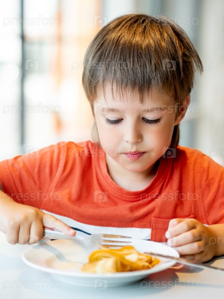 Маленький ребенок в красной футболке ест блины ножом и вилкой. Любопытный мальчик с озадаченным выражением лица. Вкусная выпечка на завтрак