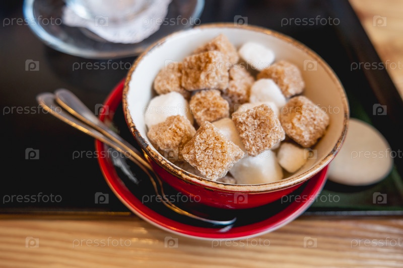 Красная миска с двумя видами сахара - белым и тростниковым. Сладкие кубики для горячего напитка в кафе