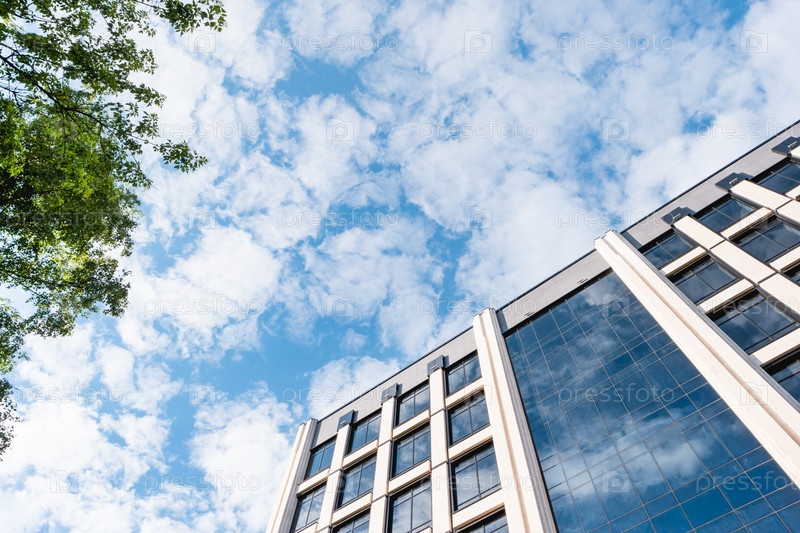 Вид снизу на здание бизнес-центра на фоне голубого неба. Современная архитектура