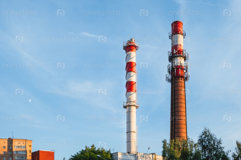 Дымоход котельной. Две башни на фоне ясного голубого неба. Промышленная зона города