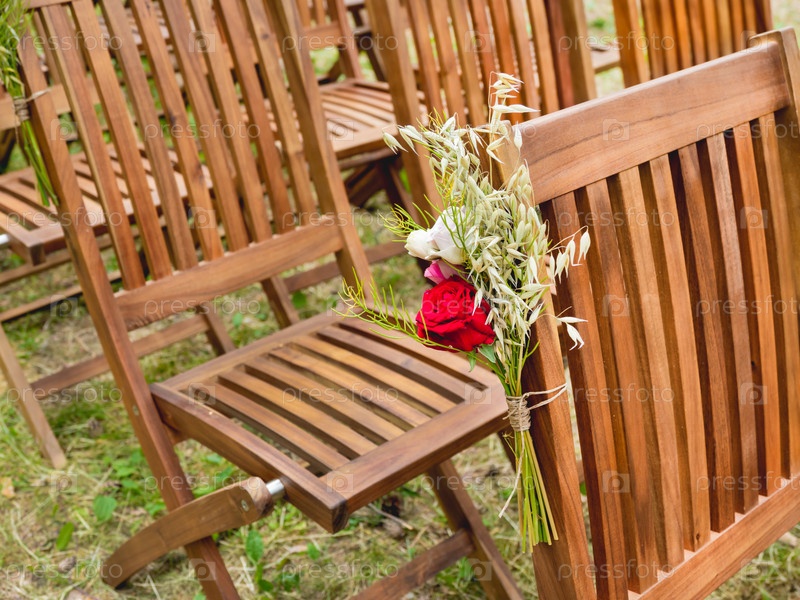 Маленький букет с розами и сухой овсяной соломой на деревянных стульях. Оформление выездной свадебной церемонии в деревенском стиле