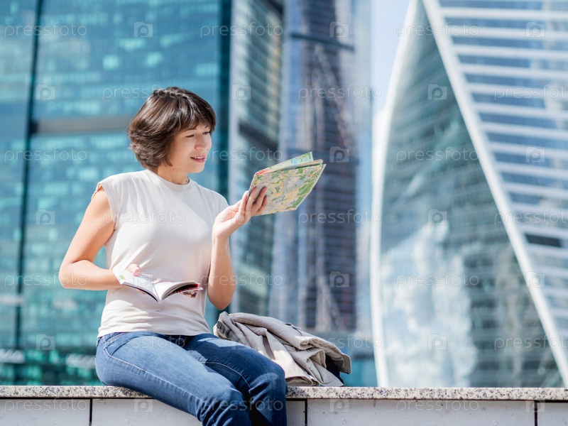 Улыбающаяся женщина читает бумажную карту, сидя на фоне зданий со стеклянными стенами. Путешествие по городу. Городской туризм. Современные архитектурные памятники