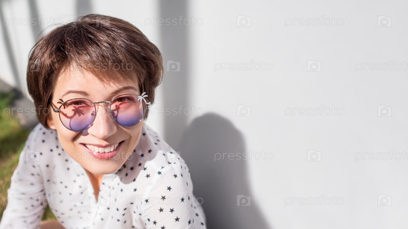 Улыбающаяся женщина в красочных солнцезащитных очках отдыхает на лужайке в городском парке. Природа в городе. Отдохните на свежем воздухе после работы. Летние вибрации. Горизонтальный баннер с копией пространства