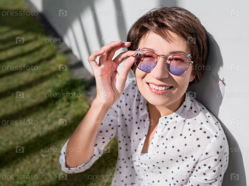 Улыбающаяся женщина в красочных солнцезащитных очках отдыхает на лужайке в городском парке. Природа в городе. Отдохните на свежем воздухе после работы. Летние вибрации