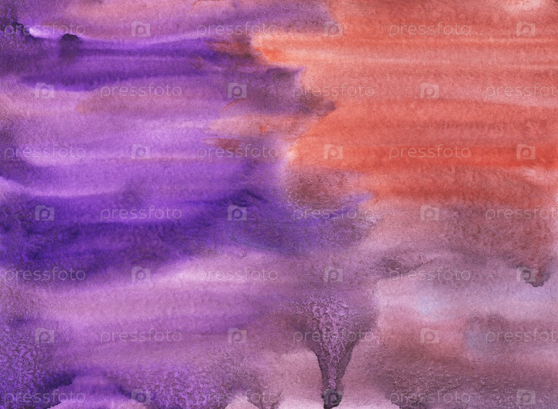 Акварель темно-фиолетовый и коралловый фон. Абстрактная живопись, мазки на бумаге. Жидкий акварельный фон