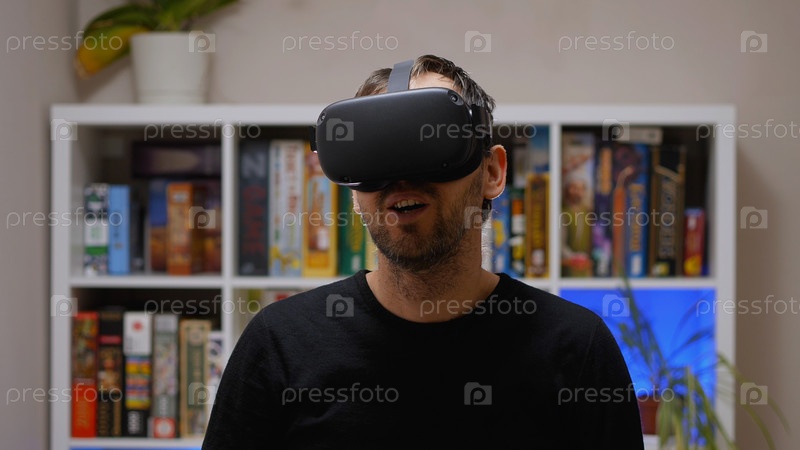 В комнате стоит бородатый мужчина в очках виртуальной реальности и черном свитере. На заднем плане стойка с настольными играми. Шлем виртуальной реальности для развлечений, обучения и игр