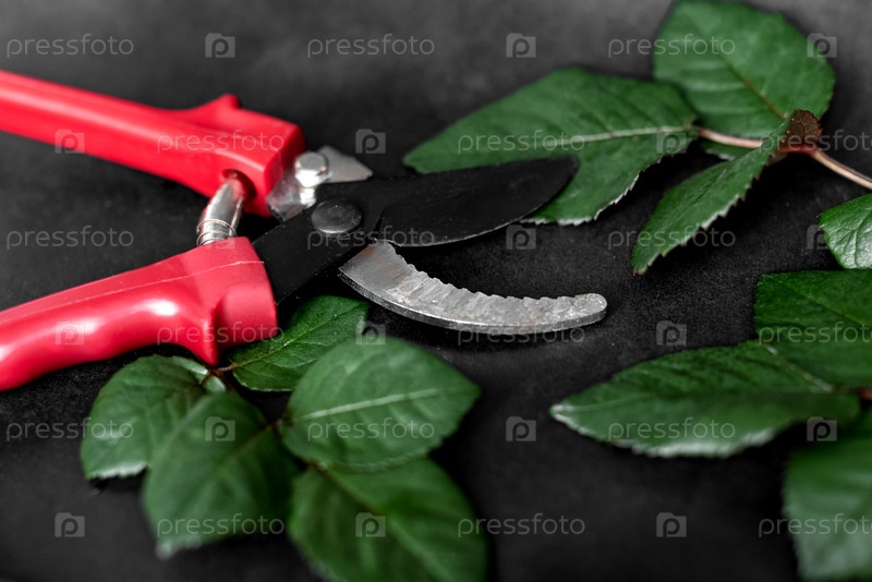 Садовый секатор среди срезанных листьев роз на черном фоне. Домашнее садоводство