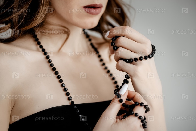 Привлекательная кавказская девушка в черном платье накрутила на пальцы бусы