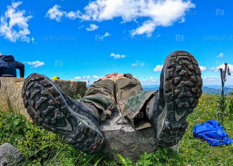 Крупный план подошв походных ботинок. Путешественник отдыхает на бревне. Широкий угол. Зеленая трава, голубое небо с облаком. Отдых в горных походах