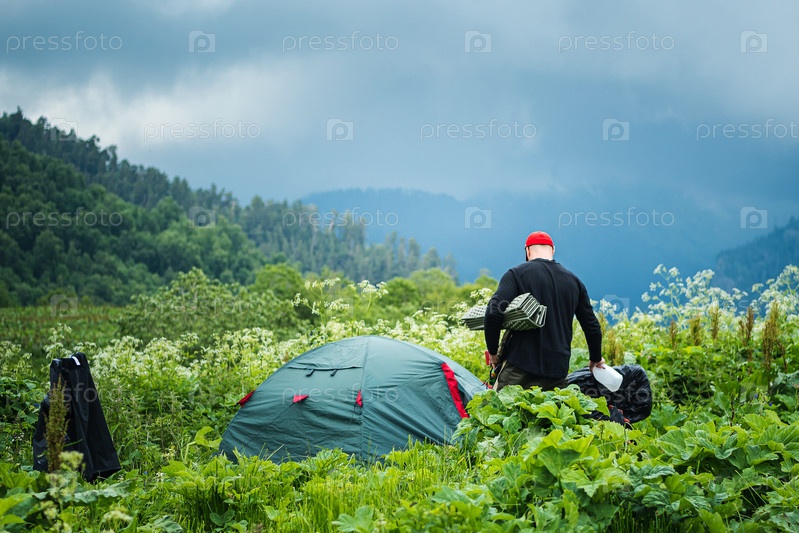 Мужчина-турист идет по высокой траве к своей палатке. Рядом сохнет его одежда. На заднем плане палатки красивые горы. Вид сзади