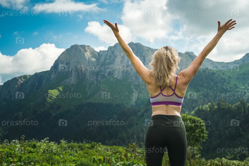 Путешественник в штанах и топе с поднятыми руками на фоне высоких гор. Вид сзади. На голубом небе есть облака. Блондинка в горах летом. Путешествие и туризм