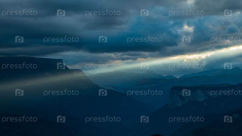 Дождевые облака над красивым горным ущельем. Сквозь них пробиваются косые лучи вечернего солнца. Красивый загадочный горный пейзаж. Горы и ущелья в красивом солнечном свете