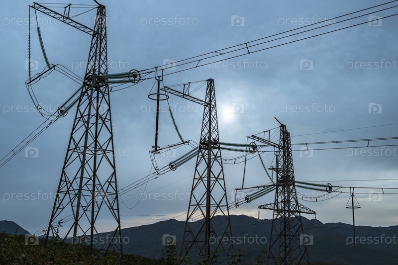 Передающие столбы на фоне горных холмов и пасмурного неба. Концепция глобального энергетического кризиса. Проблемы с электричеством в Европе и мире