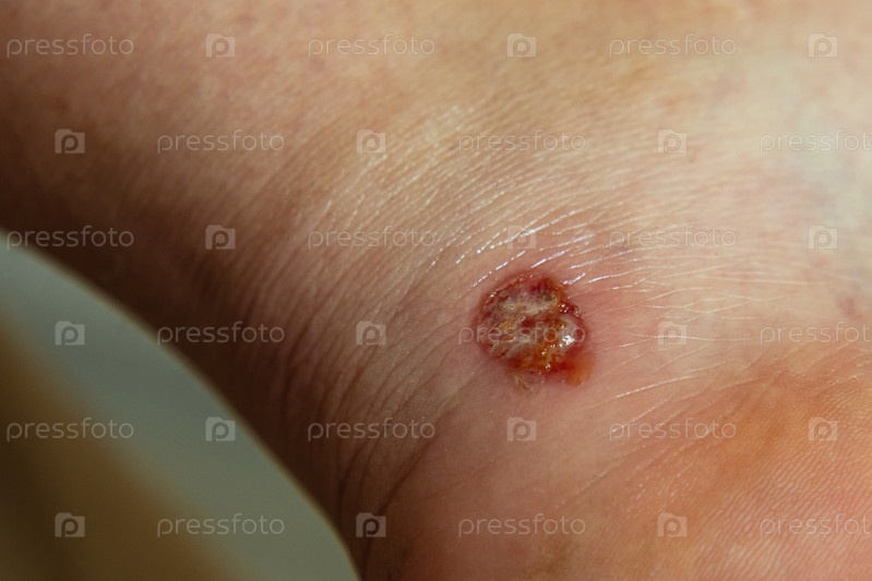 Сочащаяся кровью рана на ноге. Повреждена нога из-за новой обуви. Ранение от тесной обуви