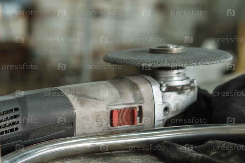 Грязная угловая шлифовальная машина лежит на столе. Рядом с ним труба из нержавеющей стали и тряпка. Крупный план. Электрический инструмент в производственном цехе. Выборочный фокус