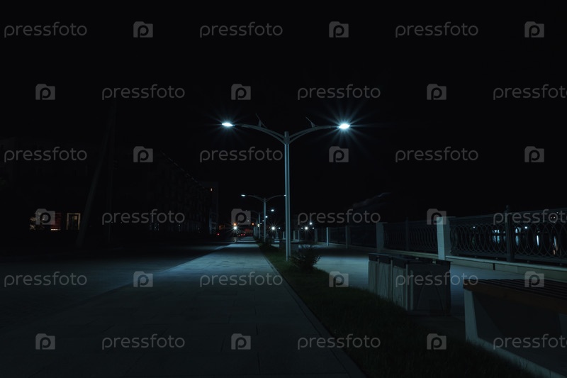 Ночная прогулка вдоль озера. Уличные фонари освещают тротуар и велосипедную дорожку в городском парке