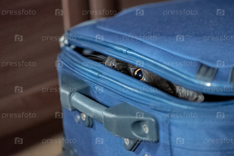 Забавный кот прячется в чемодане. Концепция путешествия в отпуск