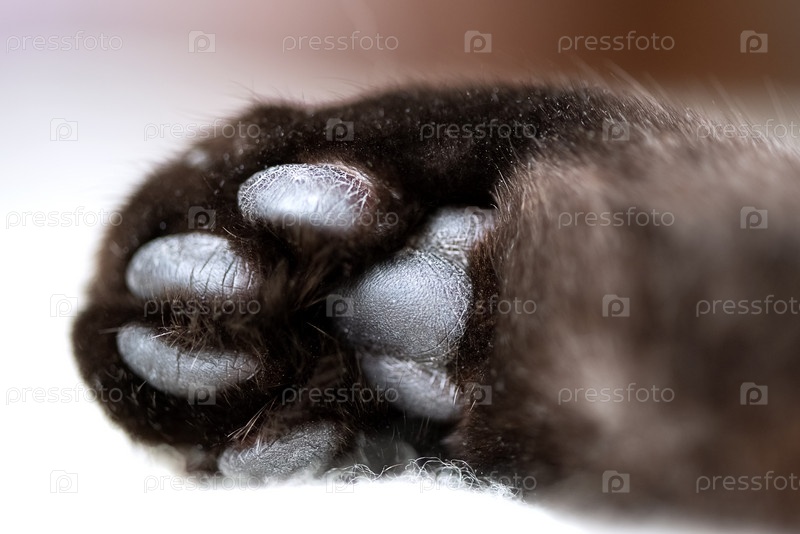 Черные подушечки на кошачьей лапе крупным планом