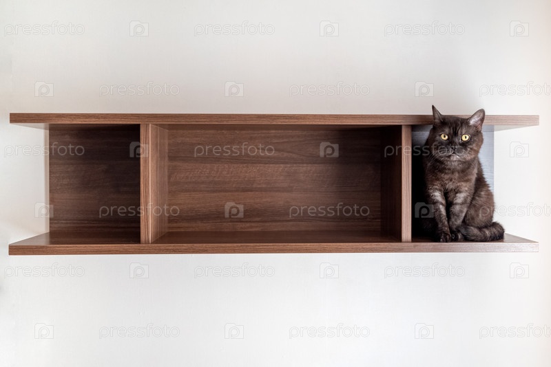 Милый кот сидит на пустой деревянной книжной полке. Пустое место для текста или объекта